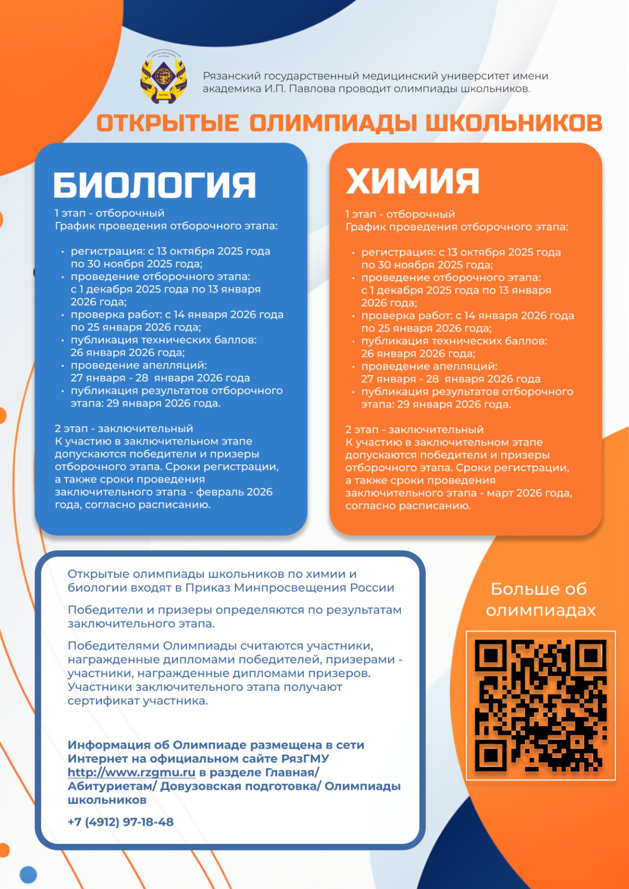 Более подробная информация об олимпиадах размещена на сайте университета www.rzgmu.ru и на сайте олимпиад dovuz.rzgmu.ru.